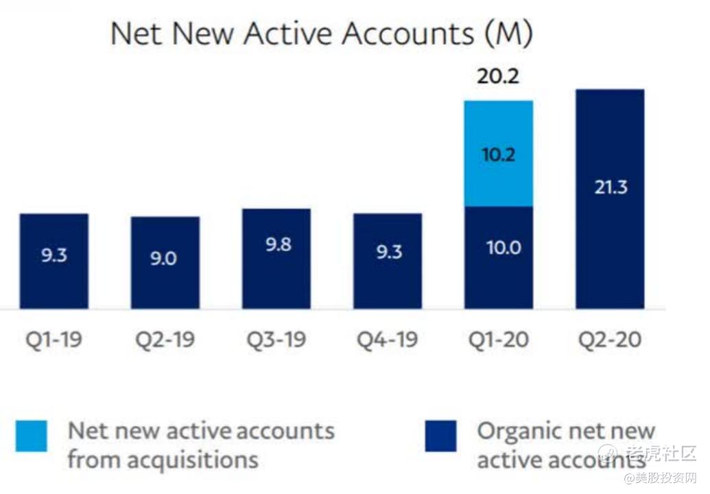 值得注意的是,980万的净新增活跃账户包括了去年收购日本先买后付独角兽公司Paidy后转移到PayPal的320万个账户。也就是可以这样理解PayPal的净新增活跃账户仅为660万。