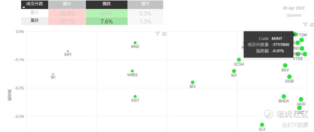 相反,如果考慮追落後,可以考慮部分量價齊跌ETF。當中包括$PIMCO Enhanced Short Maturity Exchange-Traded Fund(MINT)$ (下跌0.01%)、FTSM(下跌0.03%)以及AGG(下跌0.04%)。