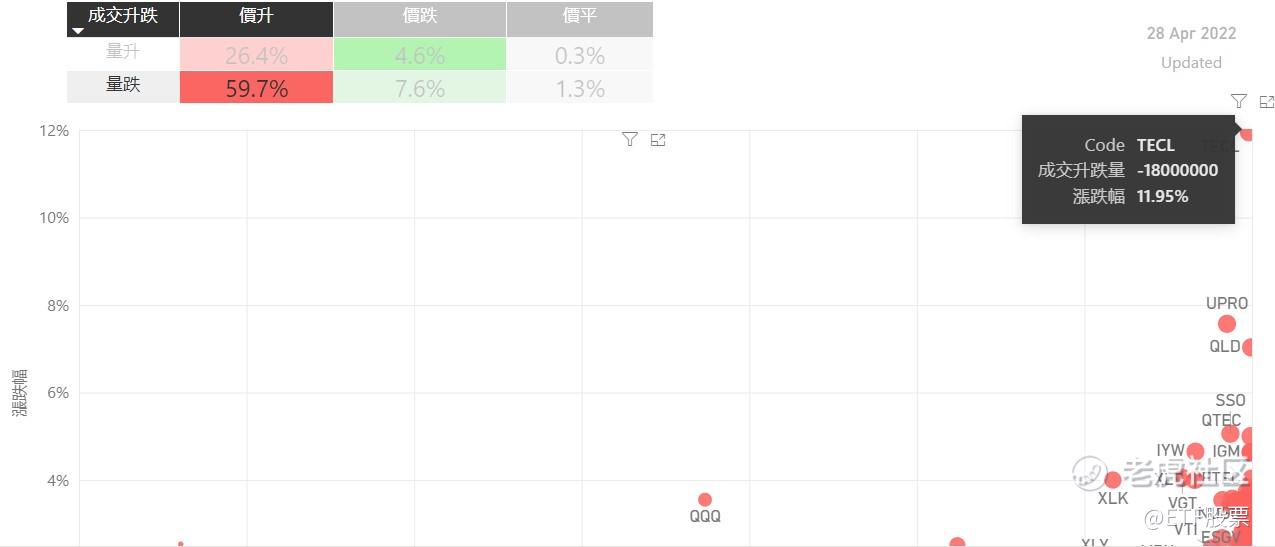 在4月28日的美股主要300隻ETF交易品種中,有86%的ETF交易品種的ETF價格上升;儘管有過半數ETF價格錄得上升,不過仍有59%的ETF產品,雖然價格上升,成交額卻下跌。