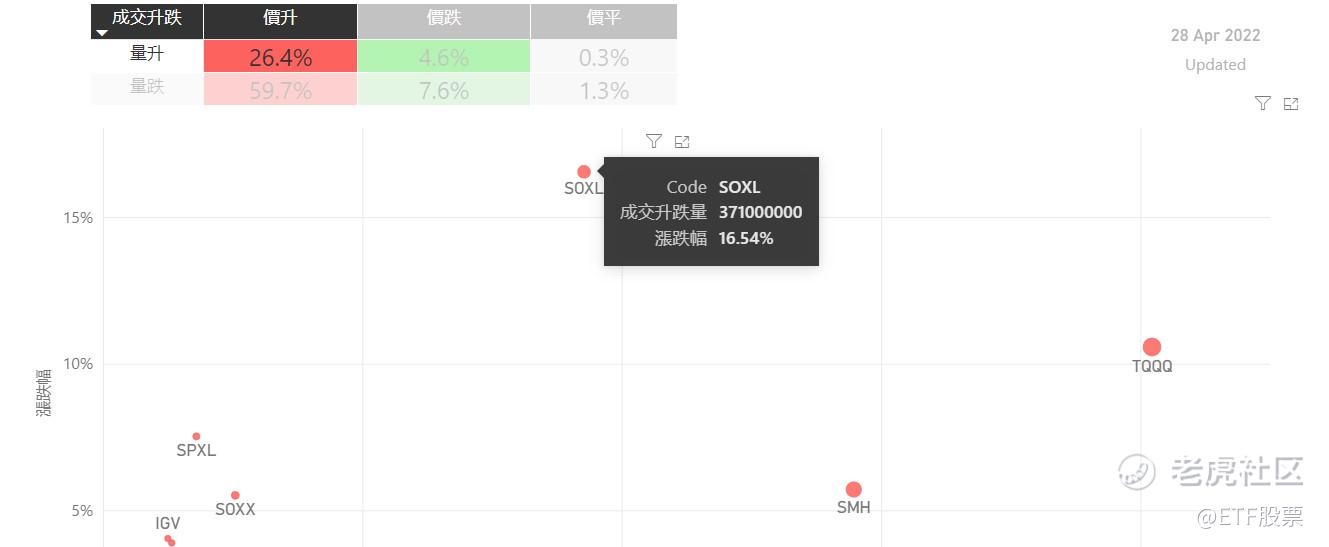如果考慮部署短期追升ETF,可以考慮以下品種,比如$三倍做多半导体ETF-Direxion Daily(SOXL)$ 、TQQQ以及SPXL,三隻ETF都分別呈現價量齊升的型態,三者分別錄得16.54%、10.57%以及7.52%的升幅。
