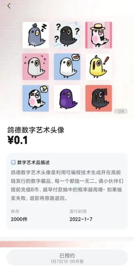 另一家公开试水NFT的巨头则是Bilibili。今年1月,B站上线了基于旗下“高能链”的首批NFT数字藏品——鸽德数字艺术头像,其产品特性与腾讯推出的“NFT鹅”有不少相似之处。B站还特别强调这批头像“以纪念意义、身份象征做支撑,不具备支付功能等任何货币属性”。同时,这批头像的购买门槛也被拉高至LV6大会员限定,最大限度杜绝了利用其进行恶性炒作的风险。