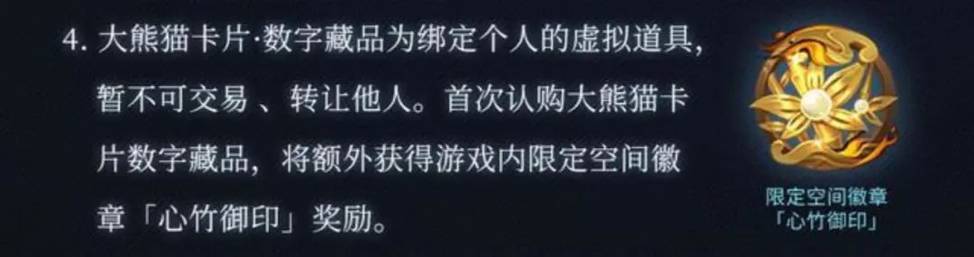 为了强化公益卡片的收藏价值,官方还在数字藏品馆内上线了公益活动日历,每张卡片都将占据日历上独一无二的一天。同时,首次认购大熊猫卡片数字藏品,还将额外获得游戏内限定空间徽章“心竹御印”奖励。