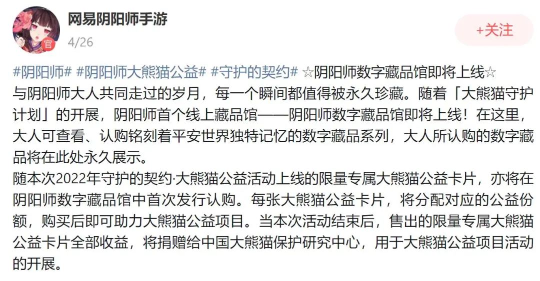 值得注意的是,此次“大熊猫守护计划”已经是《阴阳师》“守护的契约”爱心公益计划的第五年,此前四年的活动内容均是以救助流浪猫狗等小动物为主,今年是首次将这一计划拓展到大熊猫保护,并通过数字藏品馆将玩家的善举永久性记录与保存。