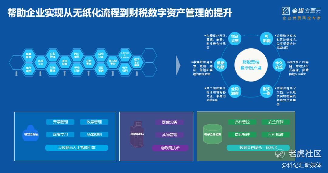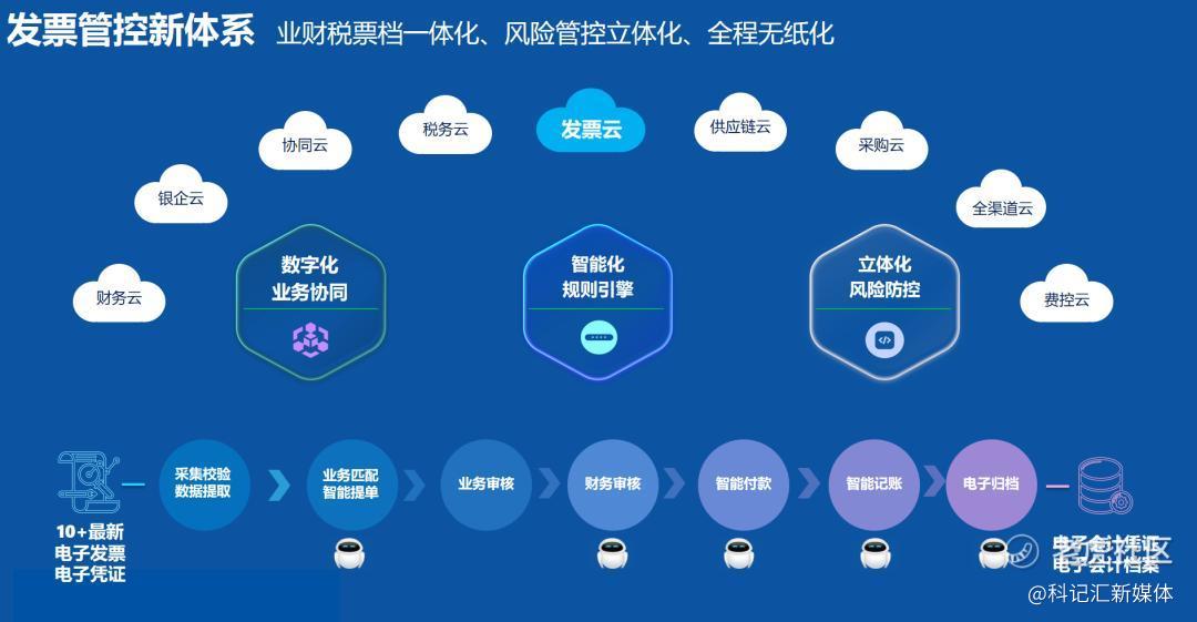 发票云整合 “智慧票据云”、“电子会计档案”和软硬件一体化“报销机器人”,覆盖销售出库、供应链协同、报销入账和归档等全流程链条。