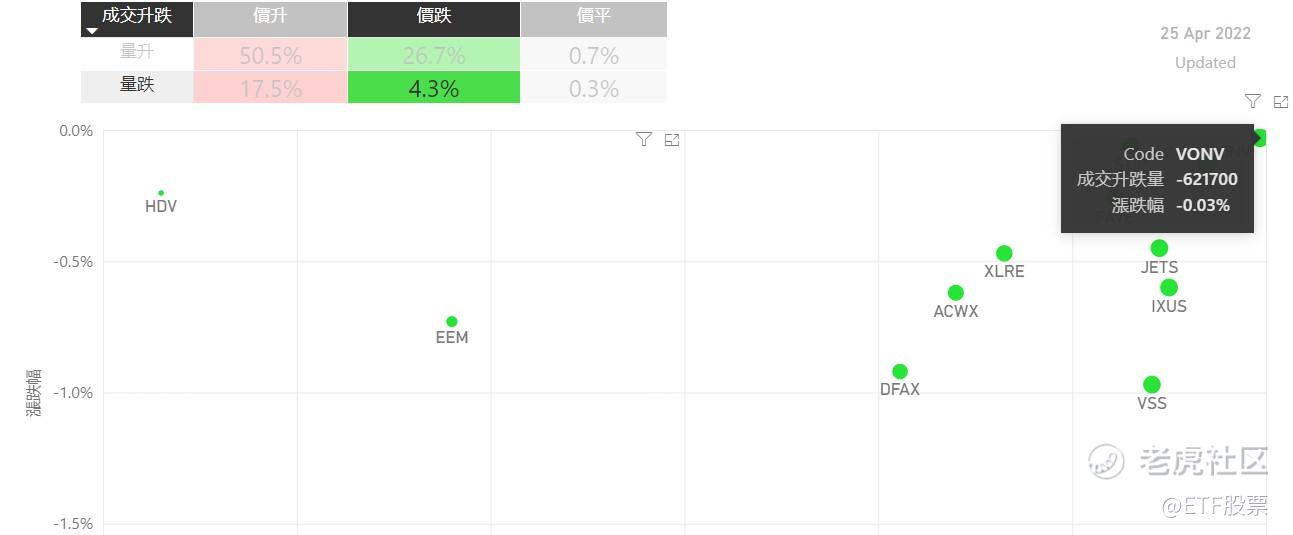 相反,如果考慮追落後,可以考慮部分量價齊跌ETF。當中包括$Vanguard Russell 1000 Value(VONV)$ (下跌0.03%)、STIP(下跌0.06%)以及DBEF(下跌0.13%)。