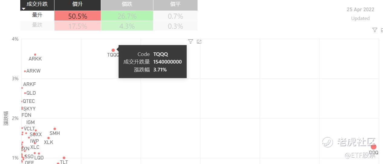 在4月25日的美股主要300隻ETF交易品種中,有68%的ETF交易品種的ETF價格上升;儘管有過半數價格錄得上升,不過仍有17.5%的ETF產品,雖然價格上升,成交額卻下跌。