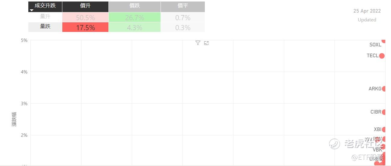 在價升量跌的ETF當中,$三倍做多半导体ETF-Direxion Daily(SOXL)$ 升幅最大,錄得4.99%升幅;其次為TECL,錄得4.50%。ARKG錄得3.46%的升幅,屬於價升量跌的ETF當中,排名第三。