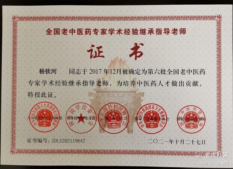 近日,中国职业教育控股有限公司(“公司”,股票代码:1756.HK)旗下广州华立科技职业学院(下指“华立职业学院”)中医药学院院长杨钦河教授荣获国家五部委联合颁发的“第六批全国老中医药专家学术经验继承指导老师”证书。