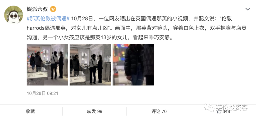 据悉,那英之所以经常来伦敦,主要是因为其孩子现正在英国读书。