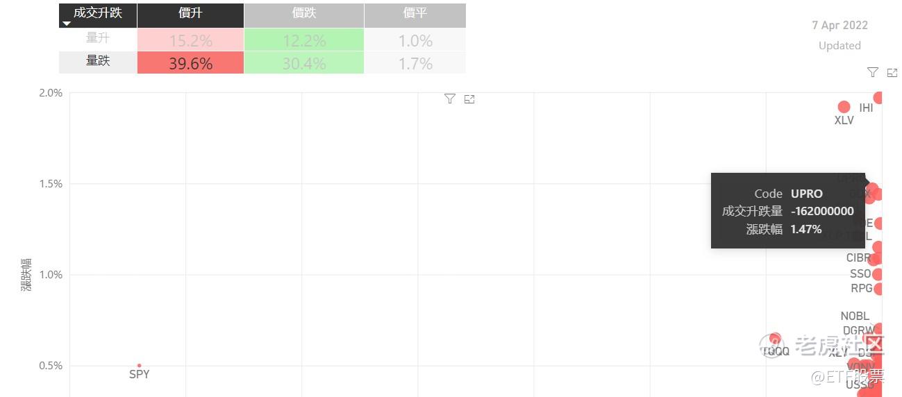 升幅最大,录得1.97%升幅;其次为XLV,录得1.92%。UPRO录得1.47%的升幅,属于价升量跌的ETF当中,排名第三。