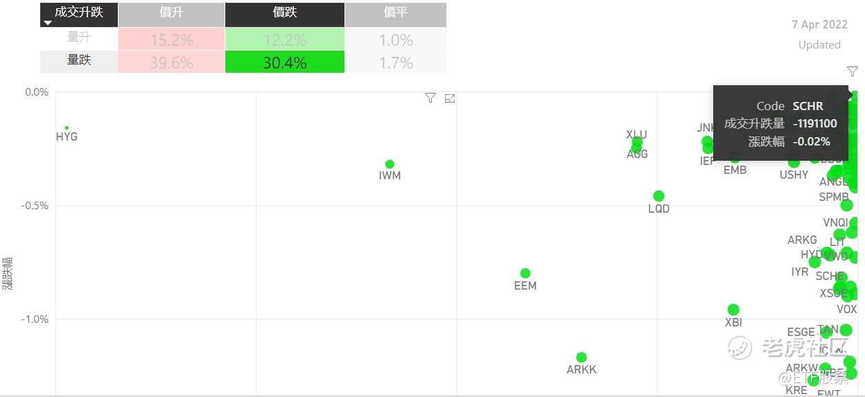 相反,如果考虑追落后,可以考虑部分量价齐跌ETF。当中包括$Vanguard Intermediate-Term Government Bond Index Fund ETF Shares(VGIT)$ (下跌0.02%)、SCHR(下跌0.02%)以及FNDF(下跌0.06%)。