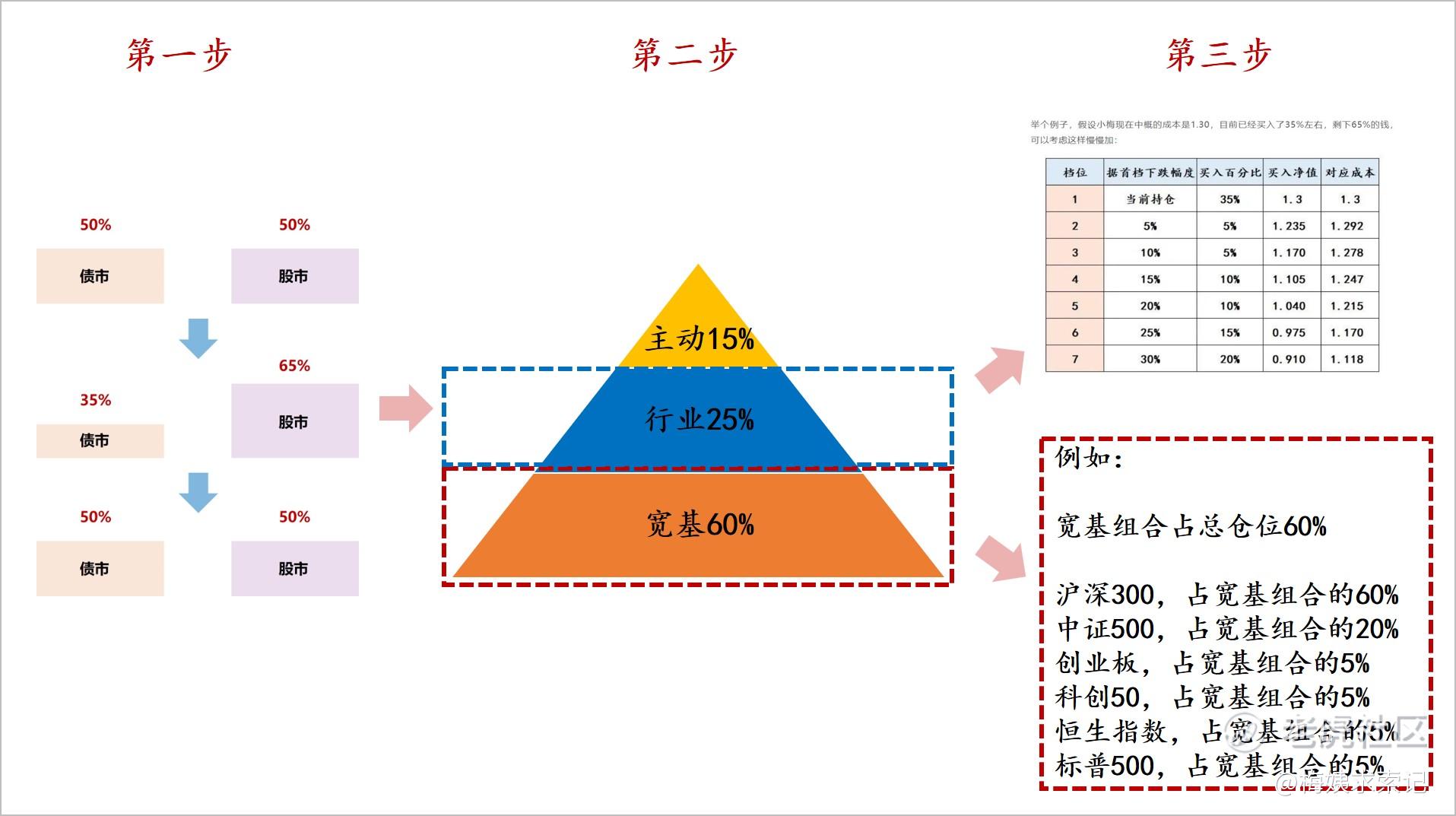 首先,就是要制定自己的股债平衡策略,然后选择主动基金、行业指数基金、宽基指数基金来构建自己的投资金字塔,最后制定每一个投资标的的加仓纪律。由大到小,由宏观到微观,逐步细化自己的投资组合,接下来就是按自己的计划一步一步去执行买入卖出操作即可。