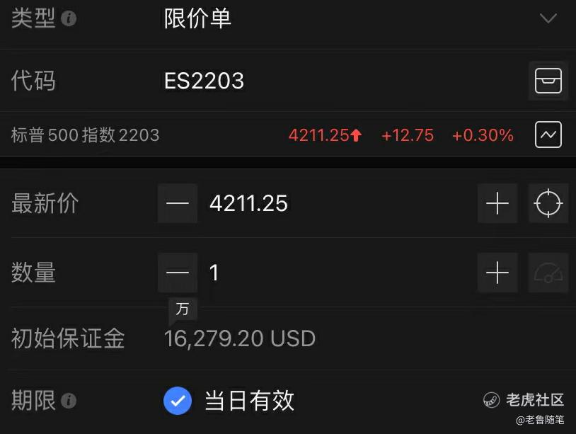 我这里根据富途牛牛的期货订单页面可以看到,标普ES期货合约初始保证金为16279美元,当前最新价4211*50/16279=12.93 ,大概是13倍的杠杆
