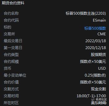我们来看下标普的两个期货,代码分别是Es和Mes,两者最大的区别是在于资金上的区别,例如标普Es 合约价值为:指数点*50美元,而Mes合约价值就为:指数点*5美元,您可以根据自己的资金量来选择不同的合约进行套利或者对冲,交易时间也是很长的,一天24小时,只有1小时不交易,其他时间都可以交易,周六周天除外。