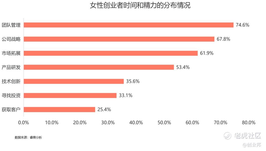 根据调研数据显示,女性在创业过程中最耗费精力和最让她们“焦虑”的是团队建设管理,其中,团队管理占比高达74.6%,其次是公司战略67.8%、紧随其后的是市场拓展61.9%和产品研发53.4%。