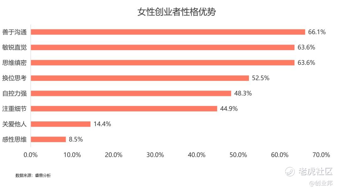 女性善于沟通协调的能力、缜密的思维、可换位思考的同理心等性格优势在创业中得到充分的发挥,她们能够自如地斡旋在复杂的团队组织中进行高效沟通。根据调研数据显示,超过60%的人都认为善于沟通、敏锐直觉和思维缜密是女性在创业过程中突出的性格优势。