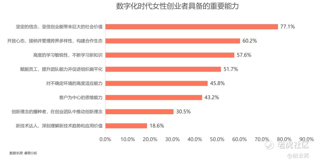 根据调研数据显示,60.2%的女性创业者认为拥有开放的心态和接纳并管理跨界多样性是创业过程中重要的能力,同时,保持战斗力、喜欢挑战、对世界抱有好奇心、高效思考和持续学习的状态也在女性创业进程中至关重要。