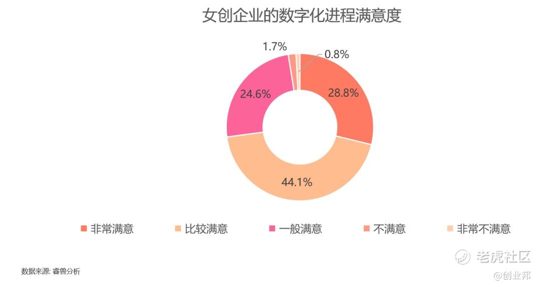 根据调研数据显示,49.2%的女创企业受到新冠疫情的冲击度比较小或几乎没影响,数字技术驱动的企业有效缓解了疫情对其的冲击和影响,同时疫情也加速了企业的数字化进程和驱动企业选择更适合自身发展节奏的战略决策。同时,调研数据显示72.9%的女创企业对自身数字化进程还是比较满意的。