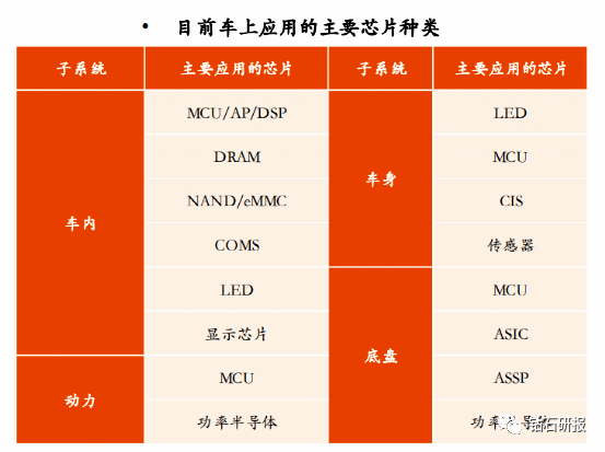 随着电动化、网联化和智能化的提速,汽车信息化水平空前提升,芯片应用快速增加。最早,车上的设备全部是机械式的;随着电子工业的发展,汽车的一些控制系统开始了从机械化到电子化的转换。目前,汽车芯片已经广泛应用在动力系统、车身、座舱、底盘和安全等诸多领域。而汽车芯片与计算、消费电子芯片不同的是,汽车芯片很少单独亮相,都是内嵌在各大功能单元中,而且多数场合是核心。