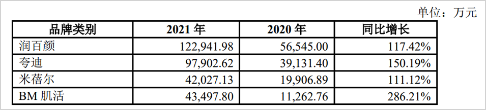 目前,华熙生物功能性护肤品四大子品牌矩阵业已成型。其中,2021年全年“润百颜”与“夸迪”两大子品牌收入近10亿元左右,“米蓓尔”与“BM肌活”两个子品牌收入超过4亿元。