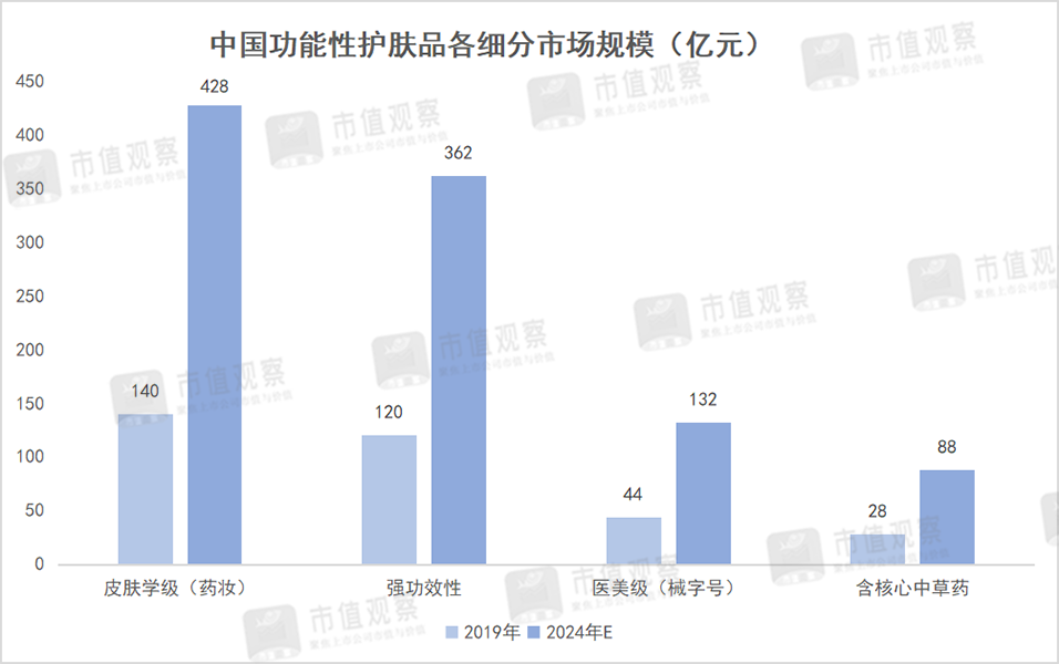 进一步讲,这也极大的抬高了公司的天花板。从市场规模上看,我国医美类玻尿酸终端产品的市场规模不到百亿元,而功能性护肤品的市场规模至少是前者的3倍左右。