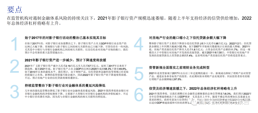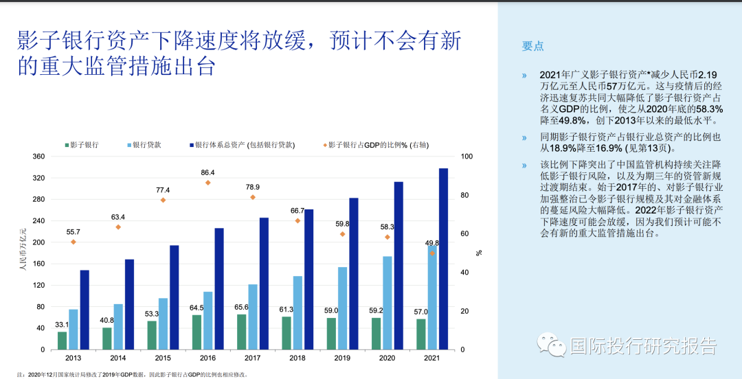 2021年影子银行资产进一步减少,预计下降速度将放缓 2021年广义影子银行资产减少人民币2.19万亿元至人民币57万亿元,延续了2017年以来的下 降趋势。截至2021年底,影子银行资产占名义GDP的比例从2020年底的58.3%下降至49.8%, 创下2013年以来的最低水平。我们预计,由于理财产品、信托贷款和金融科技等领域已经采取 的措施行之有效,新增的监管措施可能会减少,因此2022年影子银行资产的下降速度将放缓。不过,预计房地产行业的信托贷款将继续遭挤压。