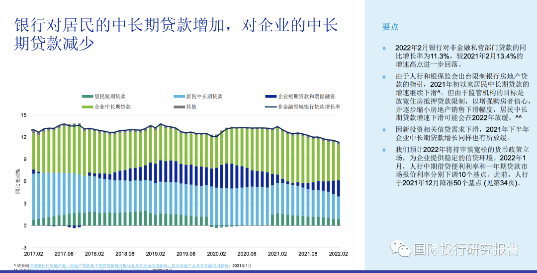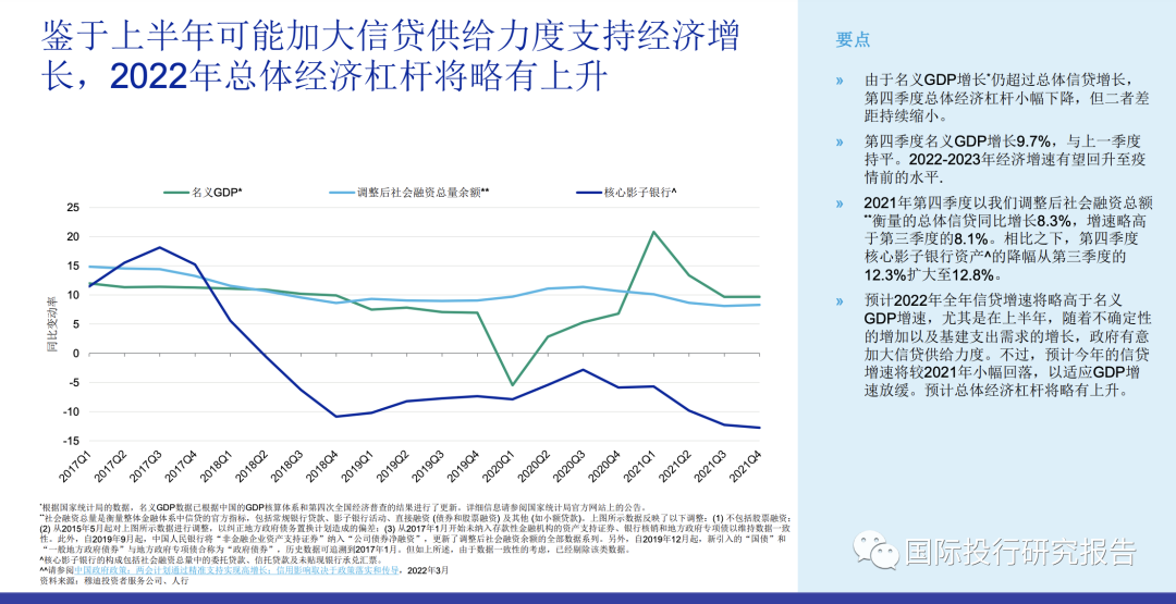 信贷及经济增速放缓之下,2022年总体经济杠杆将略有上升 2021年第四季度,以我们调整后社会融资总额衡量的总体信贷增速为8.3%。我们预计2022年 全年信贷增速将略高于名义GDP增速,尤其是在上半年,随着不确定性的增加以及基建支出 需求的增长,政府有意加大信贷供给力度。不过,预计今年的信贷增速将较2021年小幅回落, 以适应GDP增速放缓和可控的消费者价格通胀率。因此,经济杠杆率预计将略有上升。