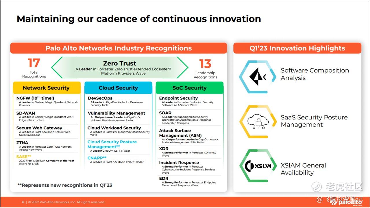 强调三点:1)“PANW只有防火墙或者以防火墙为主”这个观念还停留在三四年前,已经落伍了。2)PANW已经涉足网络安全17个细分领域,并且在其中13个领域都被认为处于第一梯队中。那么它怎么做到的呢?应该说很大一部分是靠收购来的。有些技术粉丝对此颇有微词或者不屑一顾,总认为收购体现不出技术水平。但其实能将收购来的技术和人才顺利地完成整合,达到1+1》2的效果,非常考验管理层的能力。3)而目前这种在多个细分领域都处于前列的状态,让派拓网络处于一个非常有利的地位。这是因为随着网络攻击的日益猖獗,企业用户发现他们处于一个非常麻烦的境地,理论上十几个细分领域你都需要防护,那如果你选择每个细分领域的第一名,你有可能要面对十几家不同厂商,这时候综合实力强劲的派拓网络就会脱颖而出了。