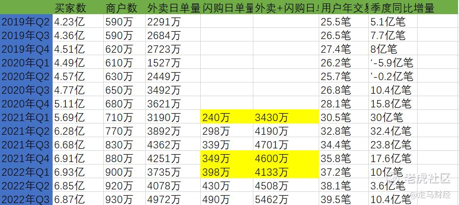 透过一组数据,能看到其中的变化。我们回头看看图4,最右侧栏显示的是美团用户的年度消费次数和单季度新增总单量。三季度单季度新增单量重回10亿笔上方,这个增长是指2022年三季度比去年同期净增的数量,10亿笔是一个很大的数字,而且美团优选在去年Q3已经是很高的基数了,说明整体的增长是非常健康的。