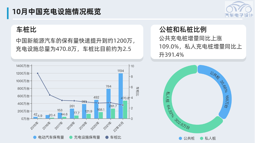 中国新能源汽车的保有量快速提升到约1200万,充电设施总量为470.8万,车桩比目前约为2.5,从历史维度来看,这个数字确实是在改善。但是我们也看到,这一波增长还是私人桩增长速率远高于公共桩。