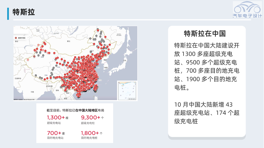 特斯拉在中国有优势,但是目前是在缩小的,哪怕是建立自己的超充桩的组装工厂,最后落地还是电网容量会限制布局。目前特斯拉在中国大陆建设开放 1300 多座超级充电站、9500 多个超级充电桩,700 多座目的地充电站、1900 多个目的地充电桩。 10 月中国大陆新增 43 座超级充电站、174 个超级充电桩。