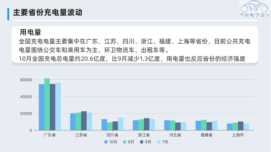 由于新能源汽车的保有量也很集中,所以全国充电电量主要集中在广东、江苏、四川、浙江、福建、上海等省份,目前公共充电电量围绕公交车和乘用车为主,环卫物流车、出租车等。10月全国充电总电量约20.6亿度,比9月减少1.3亿度,用电量也反应省份的经济强度。