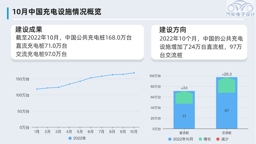 截至2022年10月,中国公共充电桩168.0万台直流充电桩71.0万台交流充电桩97.0万台。从整个建设方向来看,2022年10个月,中国的公共充电设施增加了24万台直流桩,97万台交流桩。