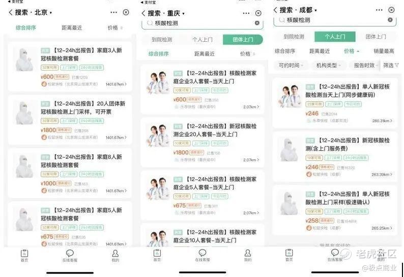 从观察来看,目前在医鹿APP上,各地城市推荐的核酸检测类型、费用接近。比如北京、成都、重庆三地,个人上门都是246元和258元两种,家庭套餐费用则标价600元到1800元不等,宣称24小时内上门服务,但服务内容差异并未有却明确展示。