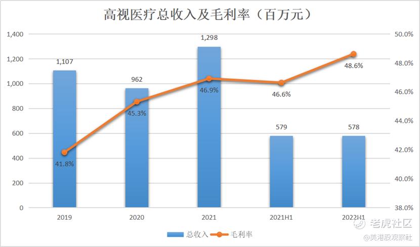 我们可以从财务上看到高视医疗两条腿走路带来的效果,首先收入保持快速增长,虽然2020年的增长受到疫情影响,不过2021年重拾增长,2021年总收入12.98亿元,同比增长34.9%。