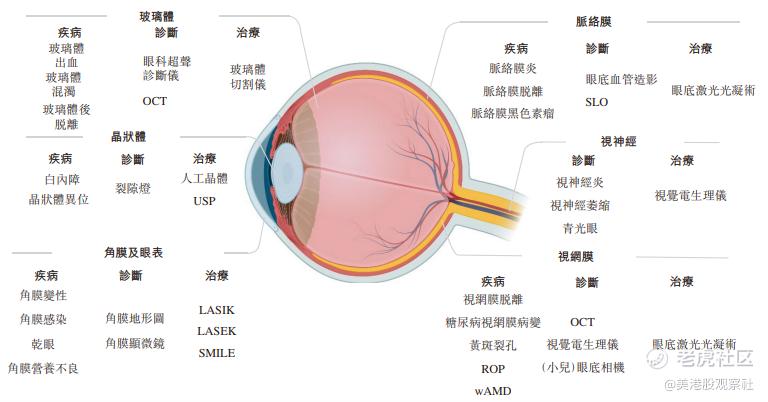 为什么选这家公司呢?我们先了解一下眼科医疗器械行业的背景。在医疗行业中,素有金眼银牙之称,而眼科适应症繁多,带来的细分赛道就非常多。通过下图我们可以了解到,不同部位都可能有不同的细分疾病,需要不同的设备或者药物来诊断以及治疗。