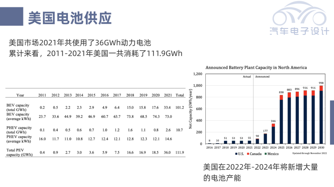 我个人的理解,这个整车本土制造,电池制造价值占比和材料来源,很早之前就和这么几家车企沟通过,我们看到整个美国的电池来源如下所示是很确定的。美国市场2021年共使用了36GWh动力电池累计来看,2011-2021年美国一共消耗了111.9GWh。而在2022-2024年将大量增加产能,从90GWh拉高到346GWh,到2025年实现838GWh,这个速度非常快。