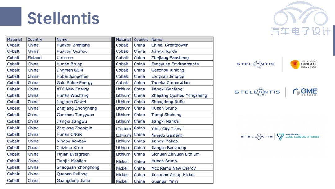 Stellantis之前就是采购中国和韩国电池,所以所有的材料除了Umicore的钴以外,全部来自中国。而随着新的法规需求,Stellantis与Vulcan Energy和Controlled Thermal Resources签署了分别为欧洲和北美供应氢氧化锂的协议。后面又与 GME 就未来电池级镍和硫酸钴的承购签署非约束性谅解备忘录。