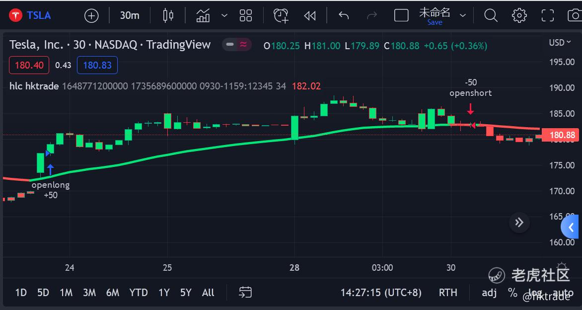 下面进入教程,首先以TSLA为例,从左至右,当EMA趋势线由红色转为绿色表示K线上穿,给出做多信号发送给程式进行做多,反之绿色转为红色表示K线下穿做空。