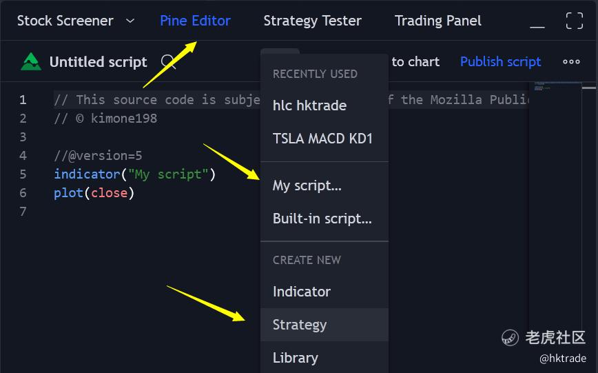 如果想配置其他策略, 依次点击 Pine Editor, Open, My Scripts(现存策略中找出一个策略 )或者 Strategy(创建填写新策略), 最后 Add To Chart 添加到图表. 添加之后方可创建Alert如上图.