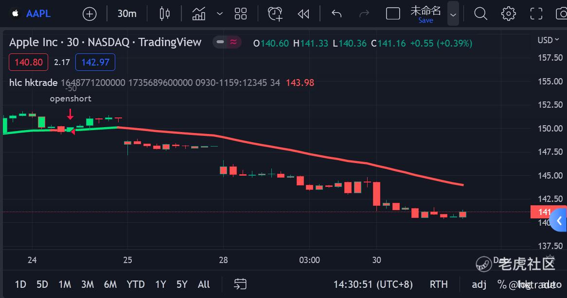 如果想做其它标的,则需要打开另一支股票K线比如 AAPL,可以看到K线下穿给出做空信号。