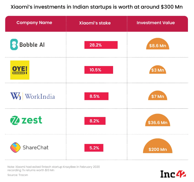 1. 小米印度在2018年宣布未来数年将投资10亿美元于印度的初创企业。紧接着,小米印度连同顺为资本在印度完成了一系列投资。根据Inc42的估算,这些投资组合的价值大约为3亿美元。基于一系列的原因,小米可能会出售其在印度投资的公司股权,并退出初创生态公司的相关业务。
