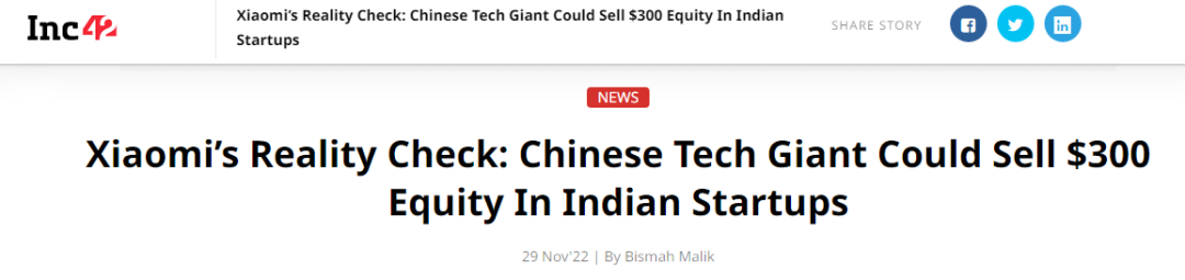 11月29日,印度科技媒体Inc42报道称,小米印度可能会出售其在印度投资的公司股权,并退出初创生态(startup ecosystem)的相关业务。