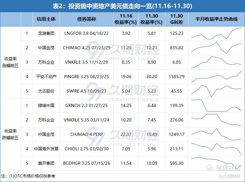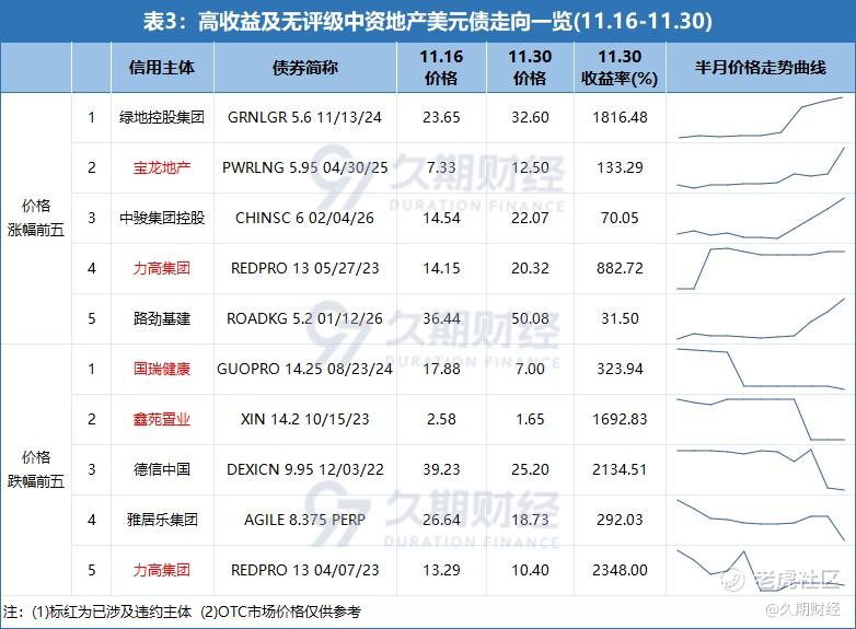所发行债券在涨幅前五的主体中,绿地控股集团进行了海外债务整体重组,其于11月24日发布公告称其9支存续美元债(共计32.41亿美元)已完成整体展期,将于原到期日偿付5%本金,其余95%在展期后的到期日偿付。