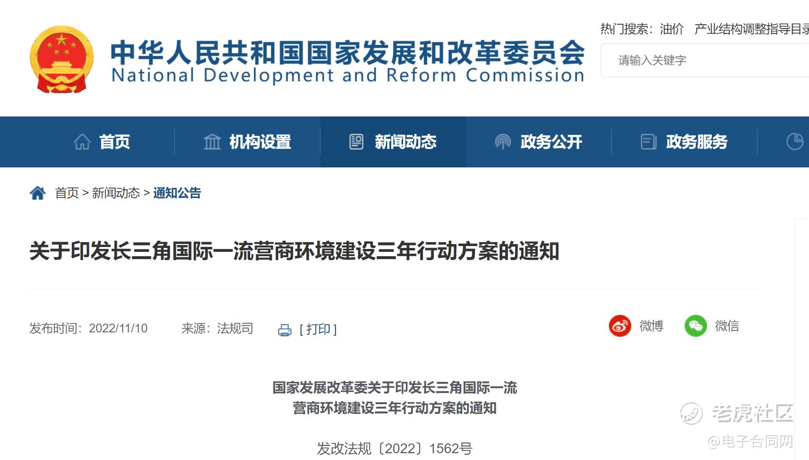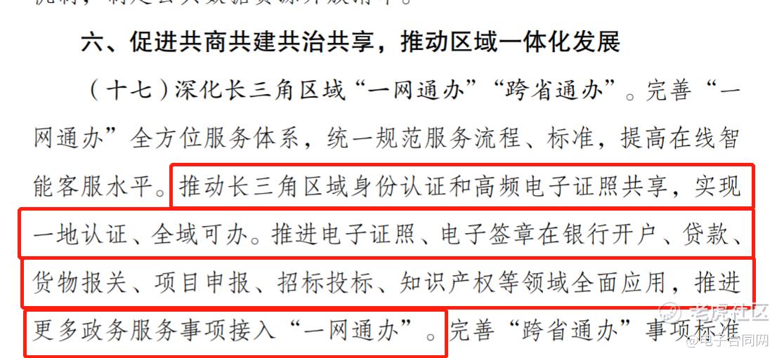 11月10日,国家发改委网站发布《国家发展改革委关于印发长三角国际一流营商环境建设三年行动方案的通知》。其中,“促进共商共建共治共享,推进区域一体化发展”这一条款明确指出“推动长三角区域身份认证和高频电子证照共享,实现一地认证、全域可办。推进电子证照、电子签章在银行开户、贷款、货物报关、项目申报、招标投标、知识产权等领域全面应用,推进更多政务服务事项接入‘一网通办’。”