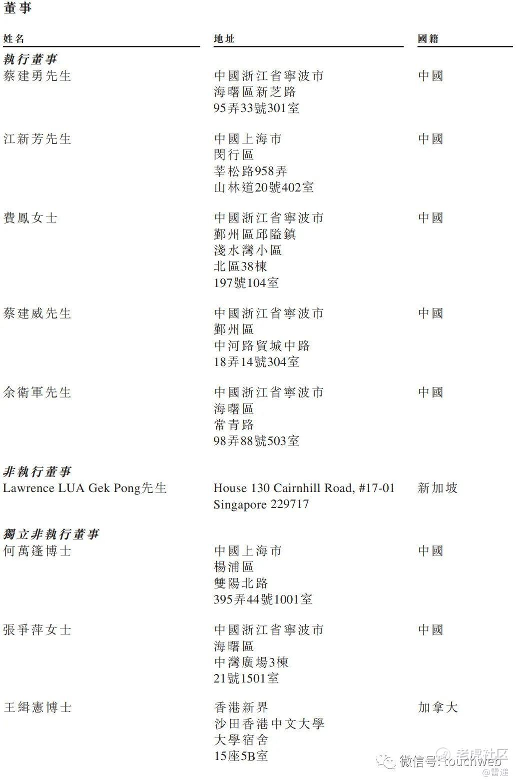 宋臻、董栋、蔡建威、蔡建松、费凤、葛凯财、何晓丹及蔡晓鸥分别持股约1.0%、0.67%、0.67%、0.5%、0.5%、0.5%、0.2%及0.66%股权。