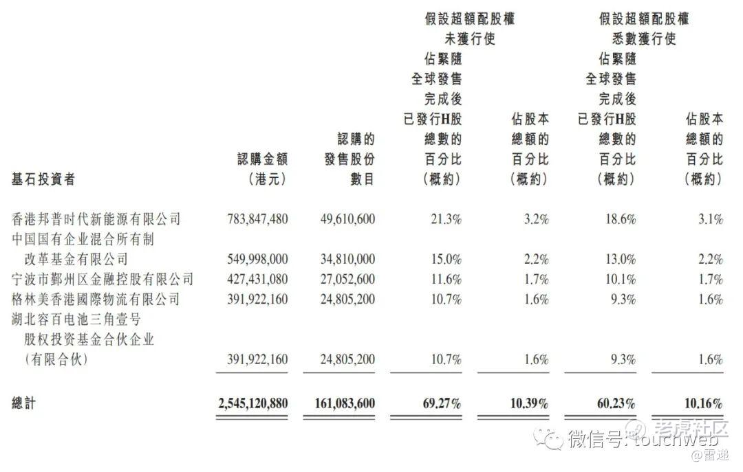 其中,香港邦普认购7.84亿港元,中国国有企业混合所有制改革基金认购5.5亿港元,宁波市鄞州区金融控股有限公司认购4.27亿港元,格林美认购3.92亿港元,湖北容百电池三角基金认购3.92亿港元。