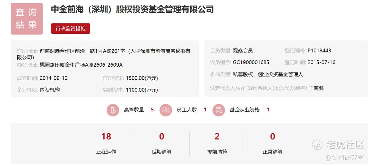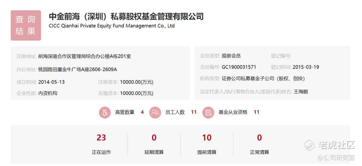 公开信息显示,中金前海私募由中金公司全资子公司中金资本运营有限公司控股,持股比例为55%。登陆中国证券投资基金业协会网站,可以看到,中金前海私募成立于2014年5月,登记时间为2015年3月。