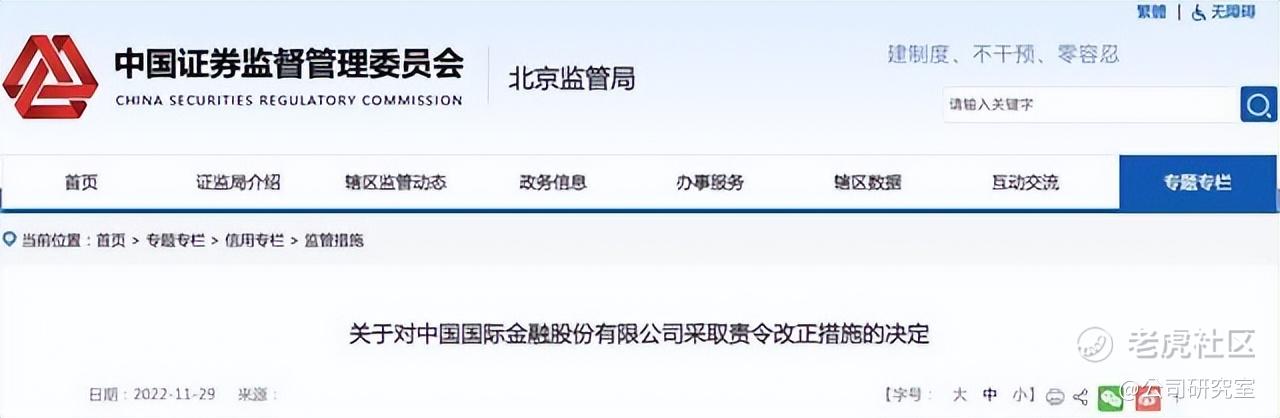 北京证监局表示,上述情况反映出中金公司合规意识薄弱,内控机制不完善,违反了《证券公司监督管理条例》第二十七条第一款的规定。根据相关规定,决定对中金公司采取责令改正的行政监管措施。