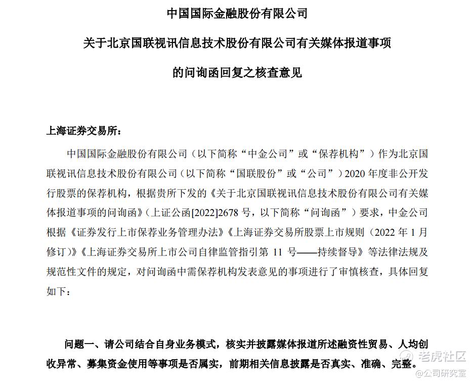 近日,沪市主板上市公司国联股份(603613.SH)因外界质疑业绩造假,股价连续跌停,作为其上市够增发项目的保荐人,面对上交所的问询函,中金公司参与了对媒体相关质疑事项的核查。